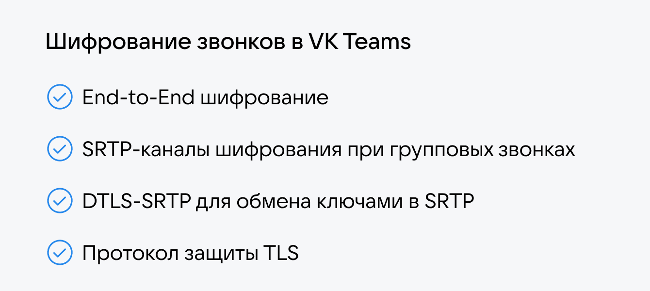 Корпоративные сервисы для коммуникаций должны использовать End-to-end-шифрование звонков. Информация, то есть сам разговор, шифруется на устройстве отправителя и расшифровывается только на устройстве получателя. Поэтому всё, что коллеги обсуждают на созвонах в приложениях для бизнеса, не могут прослушать ни провайдеры, ни злоумышленники.