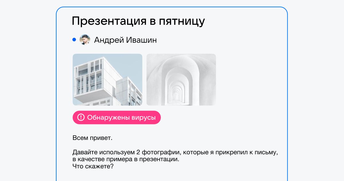 Чтобы распознавать мошеннические письма, у корпоративного почтового сервиса должен быть антивирус, который обновляется и адаптируется под новые угрозы. Он сканирует все письма, обнаруживает вредоносные вложения и блокирует их. Так сотрудники не смогут открыть и загрузить вредоносные файлы на рабочий компьютер.