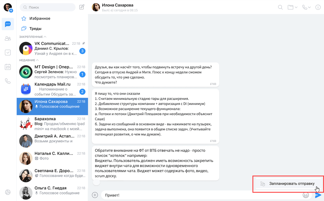 Например, в Мессенджере VK WorkSpace можно запланировать отправку сообщения на нужное время