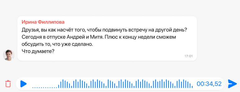 Голосовое сообщение в Мессенджере VK WorkSpace — с расшифровкой в текст