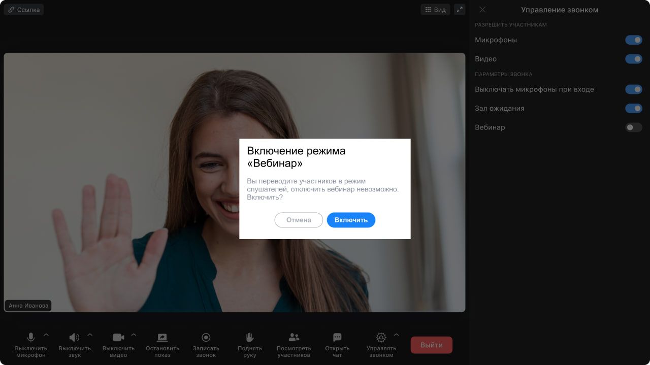Включение режима «Вебинар» в Видеоконференциях VK WorkSpace
