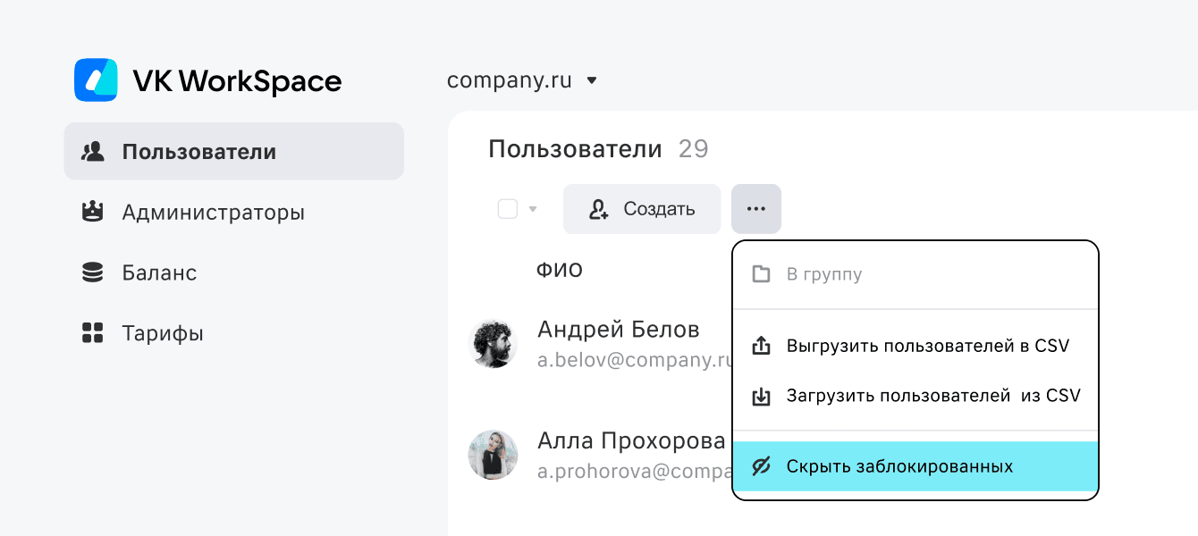 Раньше администраторы могли заблокировать неактивных пользователей в VK WorkSpace, но не могли их скрыть. Теперь такая опция доступна, и заблокированные профили не будут отображаться в общем списке.