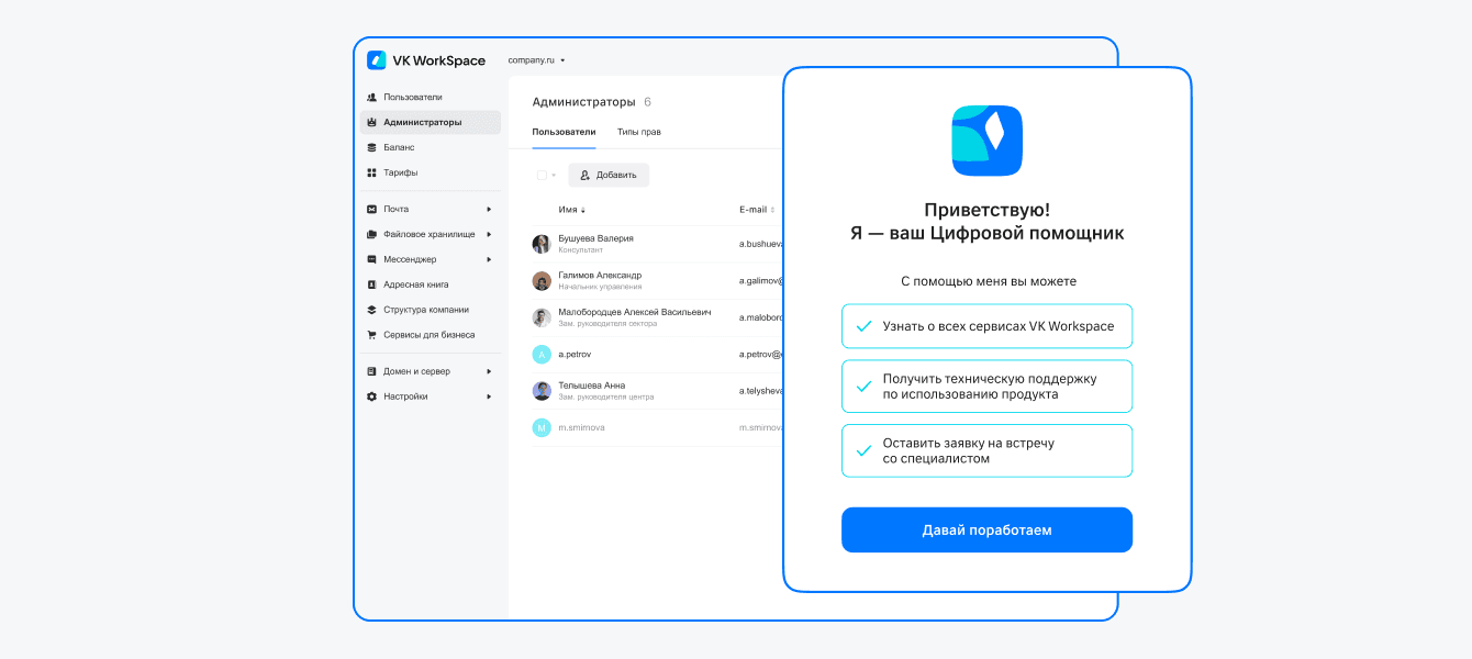 Чтобы начать диалог с виртуальным помощником, откройте панель Администрирования в правом нижнем углу → нажмите на иконку «VK Assistant» → напишите свой вопрос в чат. Цифровой ассистент доступен на базовом тарифе, а скоро появится на всех тарифах облачной версии VK WorkSpace.