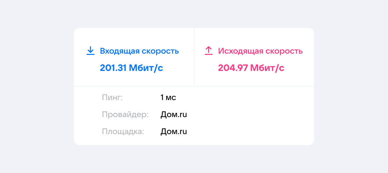 Чтобы изображение и звук были хорошего качества, входящая и исходящая скорости должны быть от 1,5 Мбит/с, а пинг — не больше 15 миллисекунд.