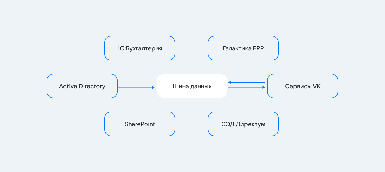 Так выглядит информационная система Финансового университета на основе шины данных. Вместо VK раньше был Microsoft