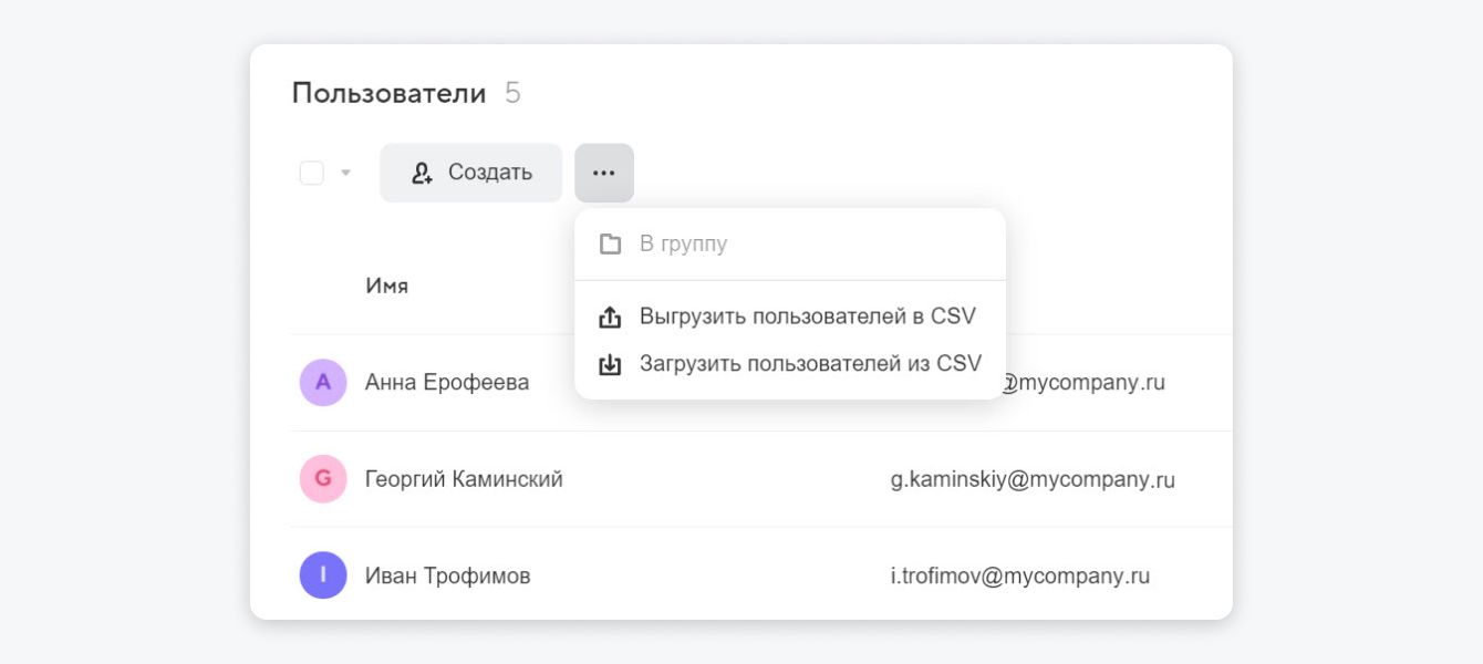 Массово импортируйте и экспортируйте пользователей с помощью CSV-файлов. Если нужно одновременно создать несколько сотен аккаунтов для сотрудников, эта функция сэкономит вам десятки часов. На тарифе «Базовый» можно добавить 300 пользователей, а на тарифе «Расширенный» — 500 пользователей.