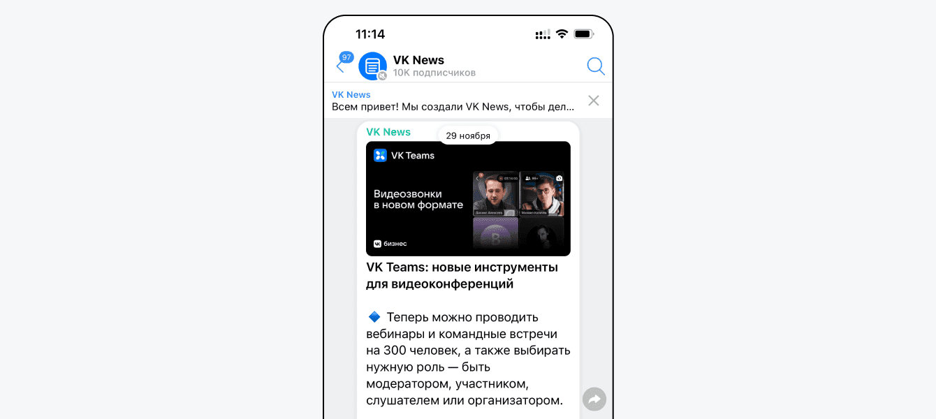 В мобильной версии VK WorkSpace для iOS и Android-смартфонов есть функция предпросмотра чата. С ее помощью можно быстро отключить уведомления, добавить чат в папку или пометить сообщение как непрочитанное.