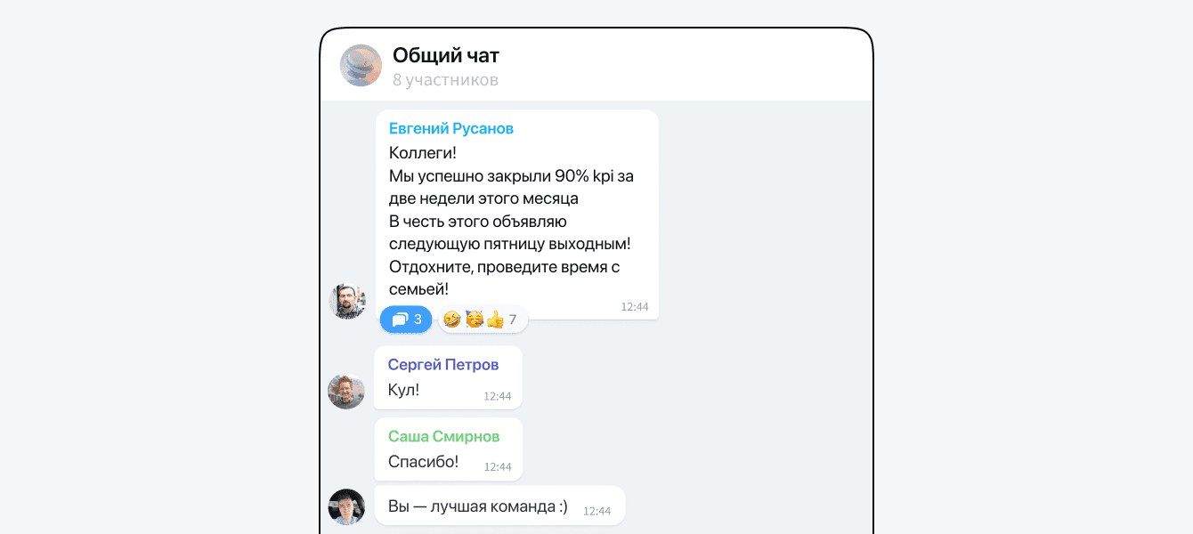 Реакции. В формате переписки сложно понять, как люди относятся к вашим словам. Это особенно чувствуется, когда вы отправляете коллеге большое сообщение, а в ответ — тишина. Реакции в чате помогают почувствовать настроение собеседника и получить обратную связь.
