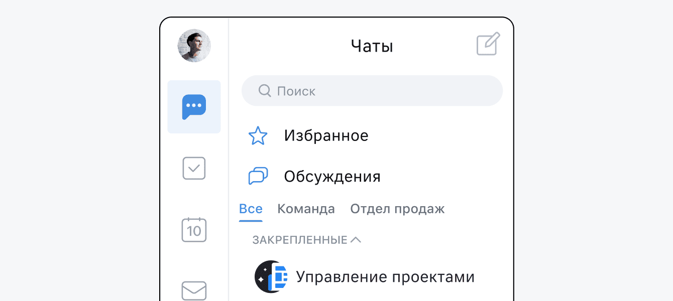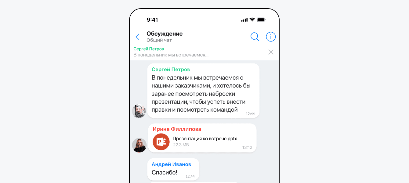 Обсуждения — это отдельные ветки сообщений внутри общего чата. Благодаря им можно не отвлекать коллег, не вовлеченных в конкретный вопрос. Это особенно удобно, если в группе много участников, которые отвечают не сразу, а в течение рабочего дня.