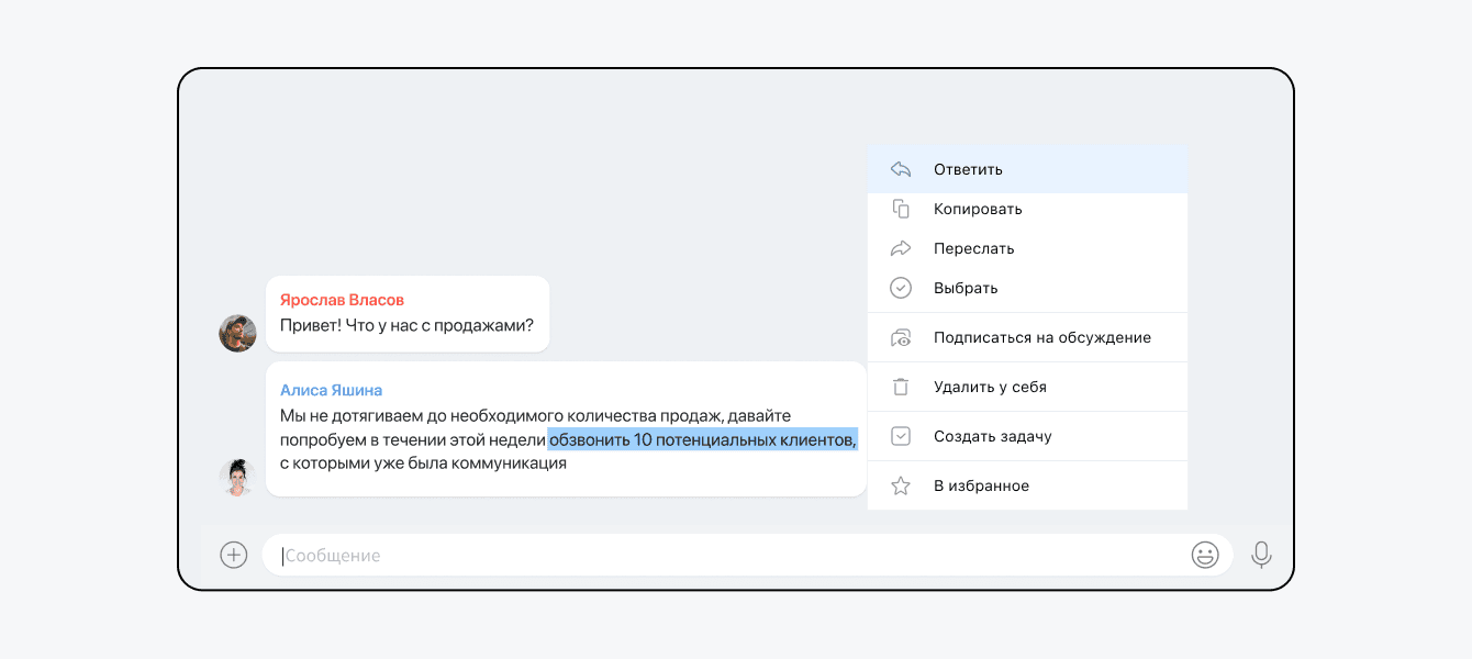 Выборочное цитирование позволяет выделить часть сообщения и ответить именно на него или отправить цитату в другой чат. Это особенно удобно, если коллега написал целую простыню текста и вам нужно прокомментировать или переслать отдельные пункты. Опция действует в настольной и веб-версии сервиса.
