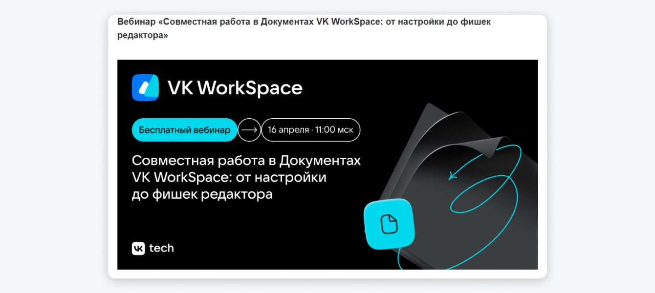 VK WorkSpace анонсирует вебинары в своих соцсетях, это наш Telegram