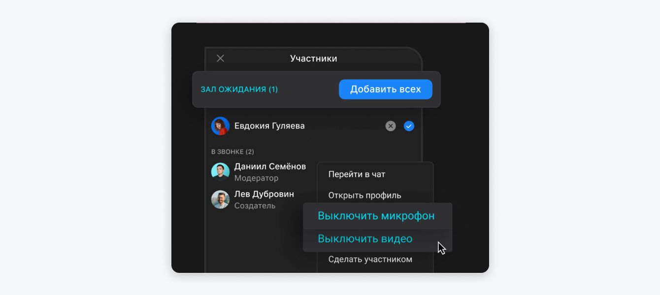 В видеоконференциях VK WorkSpace — гибкая модерация: можно собирать участников в зале ожидания и добавлять по одной кнопке, а также отключать и включать микрофоны и камеры слушателей.