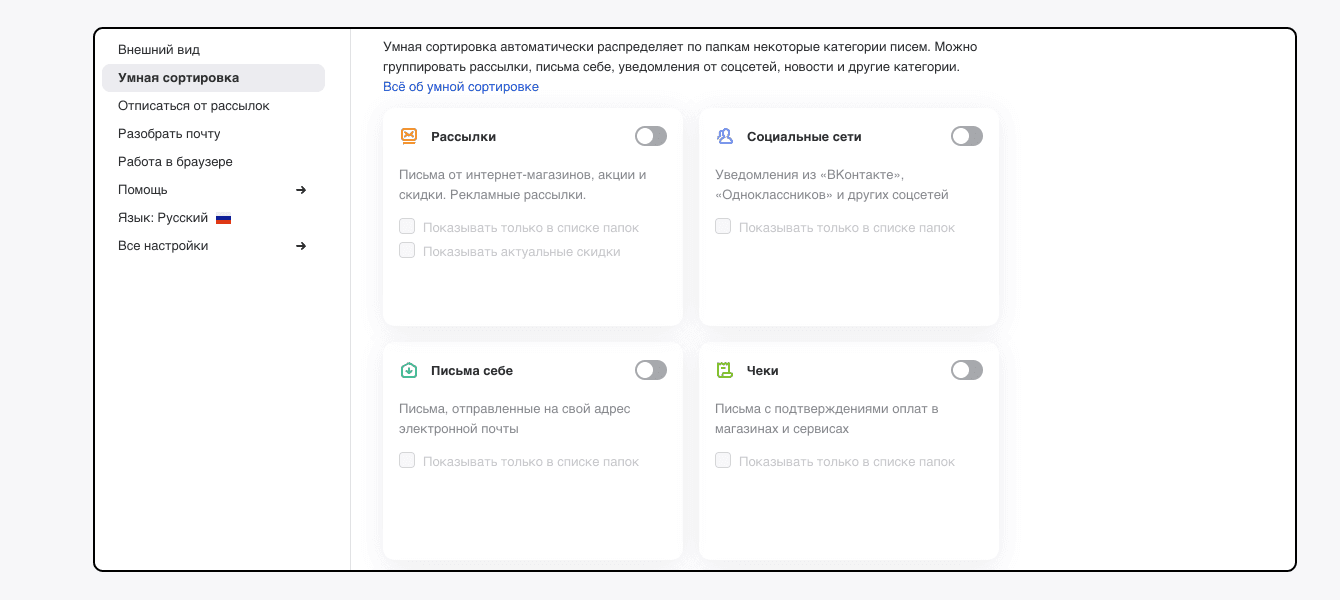 Если вы не хотите самостоятельно создавать фильтры, попробуйте «Умную сортировку». Почта сама определит тему письма и отправит его в соответствующую папку.