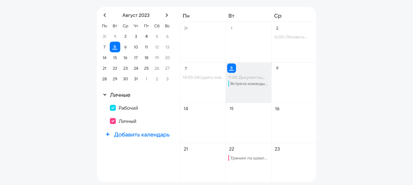 В Календаре VK WorkSpace можно создавать несколько расписаний и подключать внешние календари