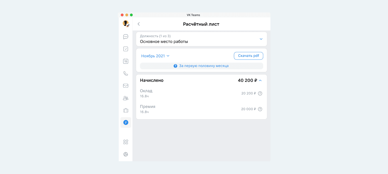В таком мини-приложении сотрудник сможет оформить расчетный лист без участия бухгалтерии. Чтобы сформировать документ, нужно просто выбрать расчетный период и скачать файл. А если в листе ошибка, ее можно исправить за несколько кликов. Бухгалтеры не погрязнут во множестве вкладок с документами по каждому работнику: все данные для расчетных листов подтягиваются в мини-апп автоматически.
