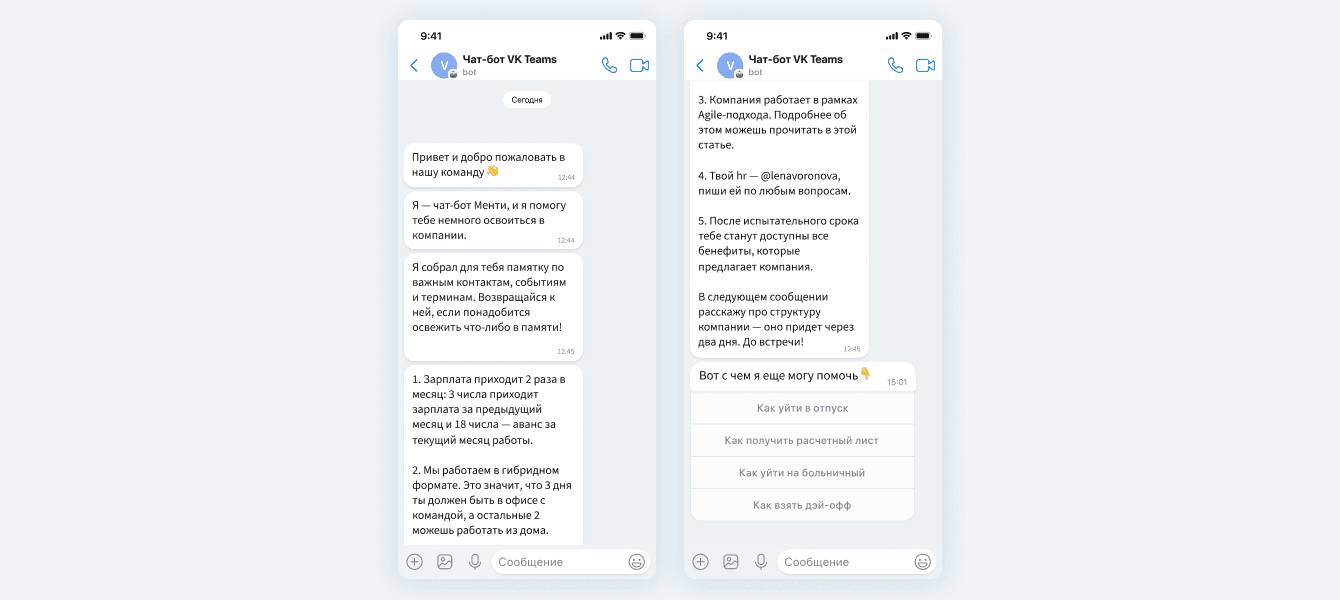 Если у компании нет возможности разрабатывать и интегрировать мини-аппы, в VK Teams можно настроить чат-бота. Он будет присылать новому сотруднику полезные материалы для изучения рабочих процессов. Например, ссылку на анонс о дате аванса и зарплаты, бенефитах, структуре компании, корпоративных ценностях и другую информацию, которая поможет быстрее влиться в работу.