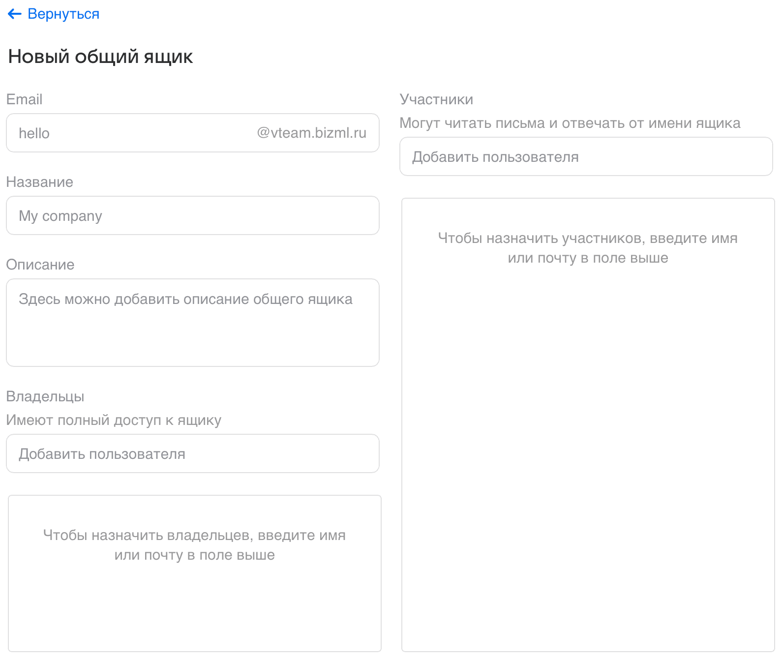 Перейдите в раздел «Почта → Общие ящики» и создайте общий ящик. Это будет адрес, который получатели увидят в ваших письмах. Укажите имя ящика и сохраните настройки.