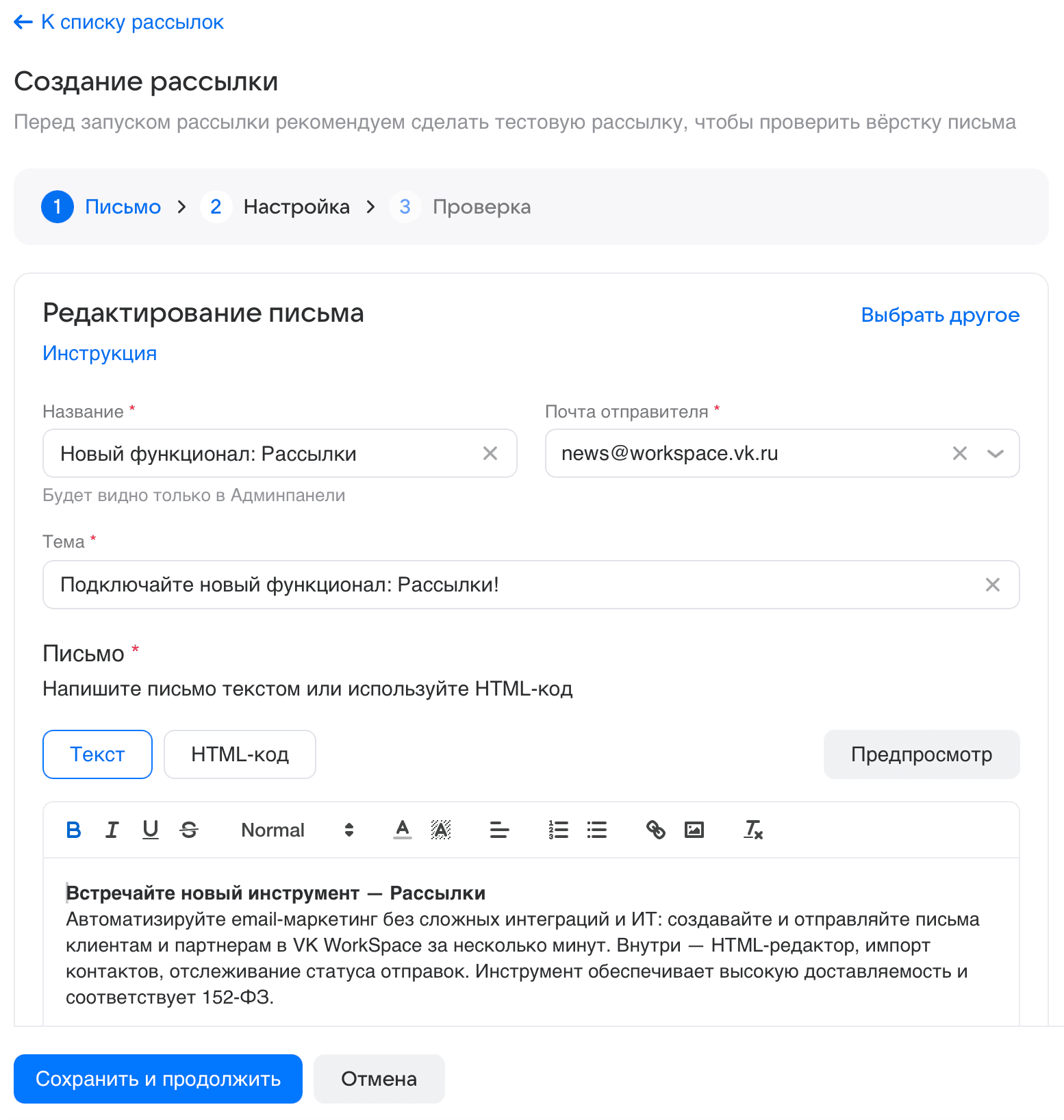 Уже пользуетесь VK WorkSpace? Подключите Рассылки в панели администратора.