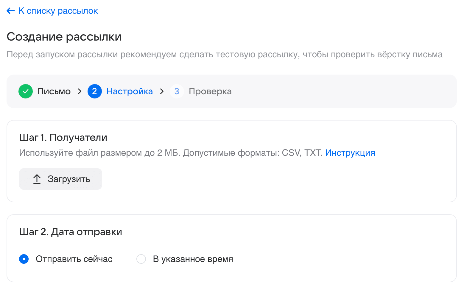 Настройте дату и время отправки. Можете запустить рассылку сразу или запланировать на удобное время. После проверьте все настройки и нажмите «Запустить».
