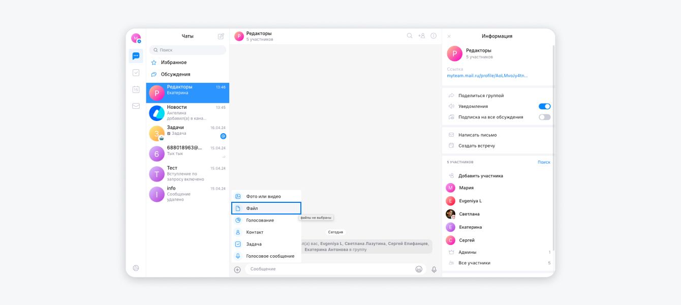 В чатах сотрудники не только обмениваются сообщениями, но и делятся файлами. В диалоге можно прикрепить фото или видео весом до 4 Гб.