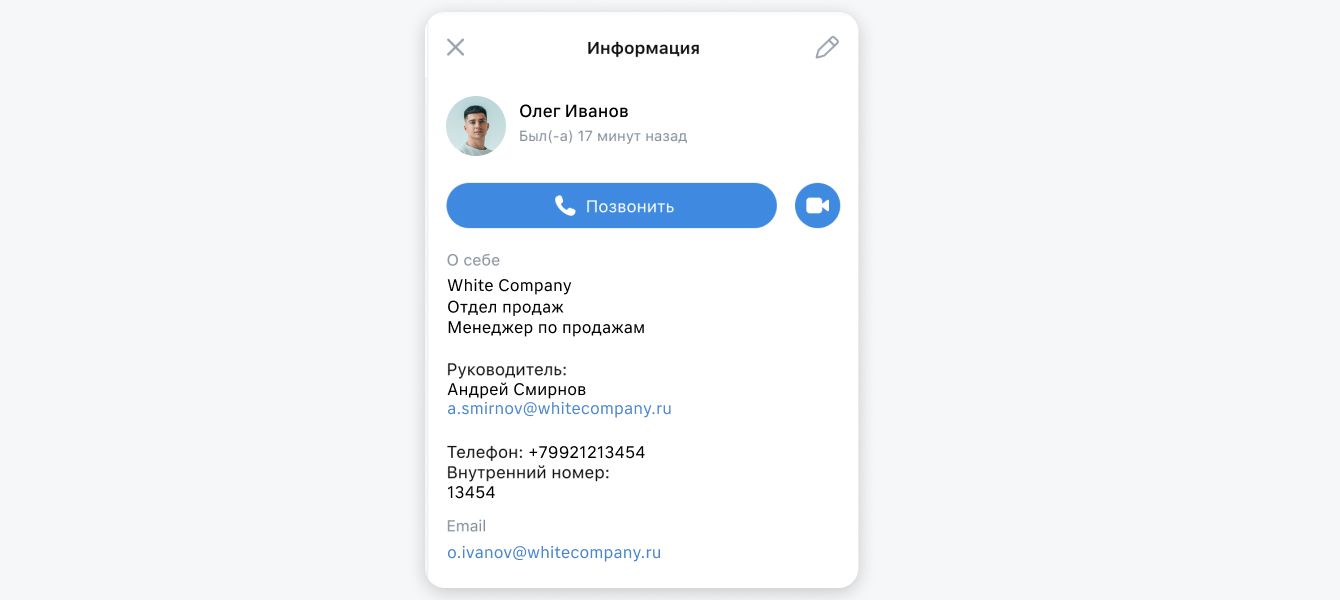В профиле каждого сотрудника есть кнопка «Позвонить» и возможность устроить видеозвонок. Источник: фотобанк VK