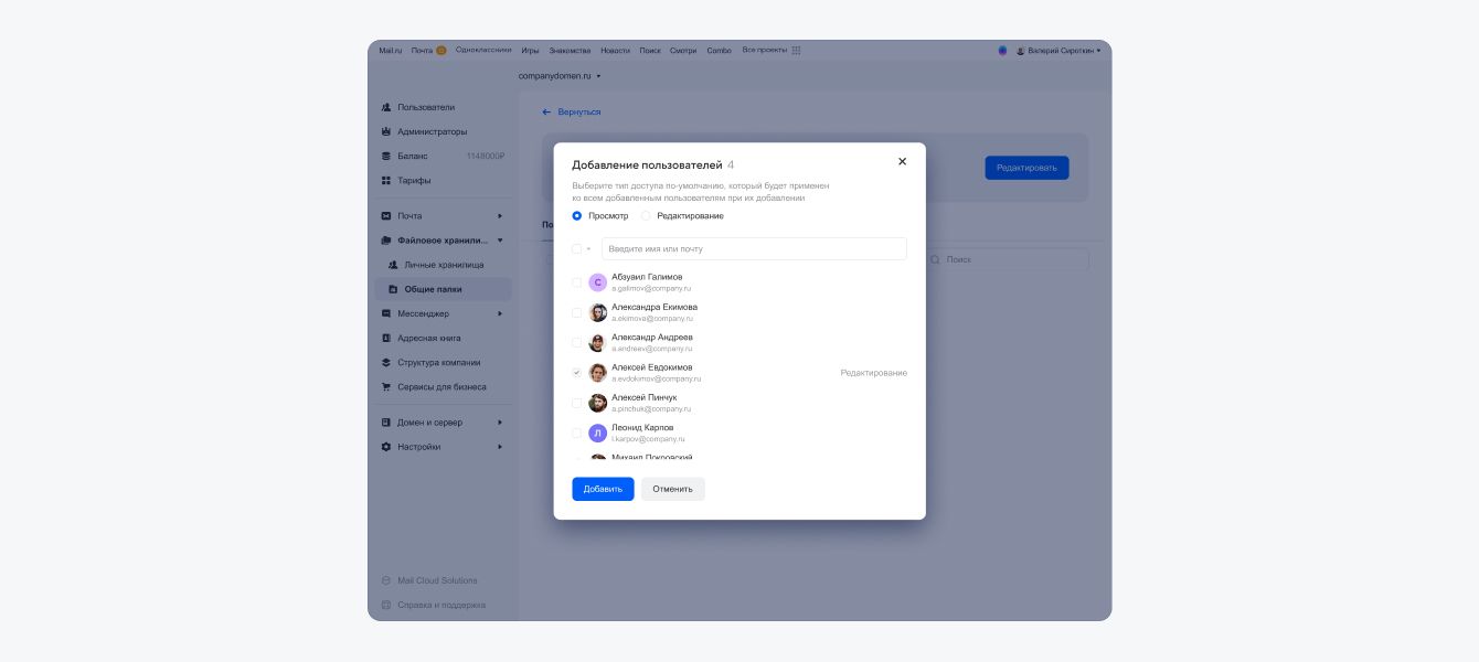 Отделы могут создавать общие папки и добавлять в них пользователей. Для этого нужно отметить галочками нужных людей и выбрать тип доступа для каждого: «Редактирование» или «Просмотр». Источник: фотобанк VK