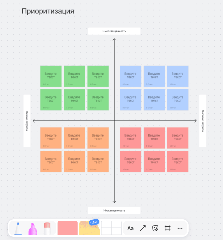 В сервисе Доска VK WorkSpace можно выбрать шаблон «Приоритизация», чтобы после мозгового штурма распределить идеи по ценности и затратам