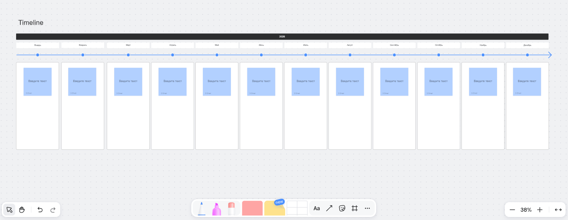 Чтобы распределить этапы адаптации сотрудника и новые задачи, можно использовать шаблон таймлайна на Доске VK WorkSpace