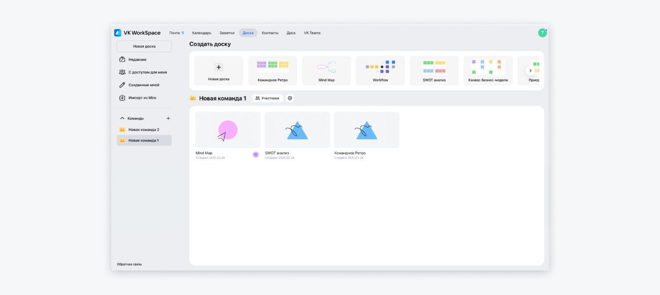 Попробуйте Доску VK WorkSpace — сервис для визуальной работы с идеями в составе цифровой среды VK WorkSpace. Доска работает рядом с Мессенджером, Почтой, Документами и другими инструментами для команды. Всё доступно в едином защищенном Супераппе и управляется из общей панели администратора. VK WorkSpace доступен по подписке в облаке или с установкой в контур компании.