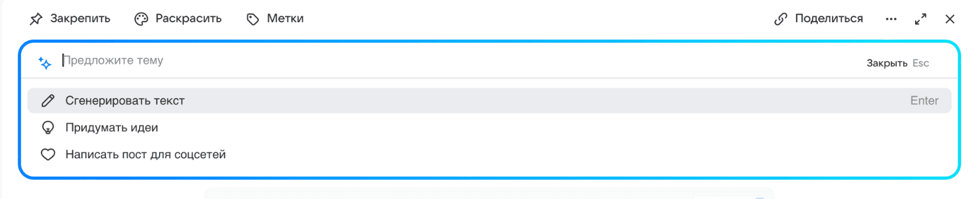 Применяйте искусственный интеллект. Попросите виртуального помощника сгенерировать текст, придумать идею или создать пост для соцсетей — и сохраните результат в онлайн блокнот одной кнопкой.