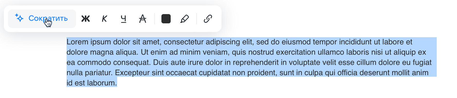 Также вы можете сократить выделенный текст всего в несколько кликов. Это удобно, если нужно упростить информацию, чтобы лучше ориентироваться в длинном конспекте или расшифровке созвона.