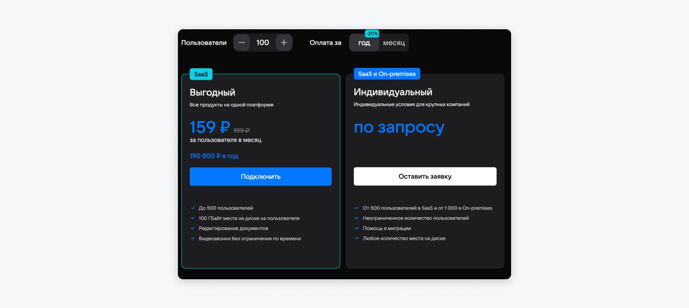 VK WorkSpace предлагает два тарифа на выбор: «Выгодный» и «Индивидуальный». На сайте можно рассчитать стоимость подключения в зависимости от количества пользователей и регулярности платежа: за месяц или за год.