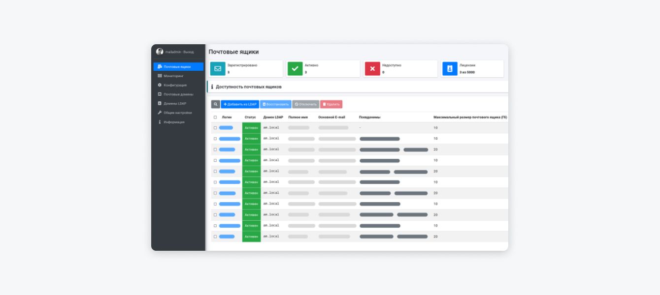 ✅ Гибкие настройки. У администратора есть возможность управлять размерами ящиков, вложений и правами доступа сотрудников, назначать правила для пересылки писем, автоматически добавлять, удалять и блокировать пользователей.