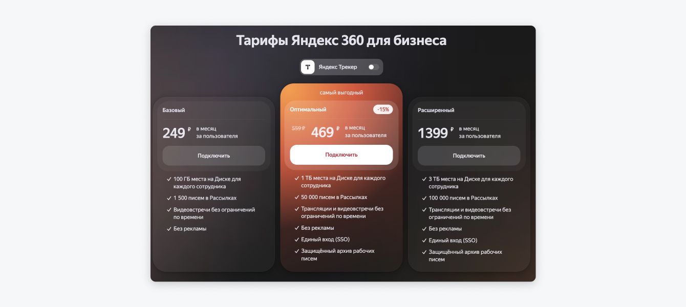Стоимость рассчитывается за одного пользователя в месяц в зависимости от количества места на Диске, писем и уровня защиты