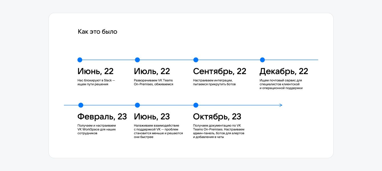 В пятницу Slack неожиданно удалил наше рабочее пространство. О блокировке нас предупредили формально: менеджер прислал одно письмо на почту, которое затерялось среди множества других. Нужно было срочно найти корпоративный мессенджер, быстро развернуть его и продолжать работать в привычном темпе. С VK Teams мы были знакомы давно, поэтому решение переехать приняли одним днем.