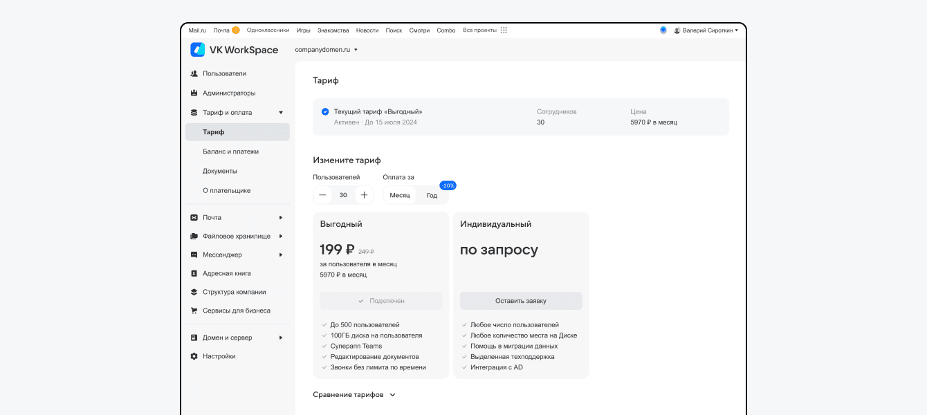 В VK WorkSpace можно изменить тариф и настроить количество пользователей прямо из личного кабинета. Вот как это сделать.