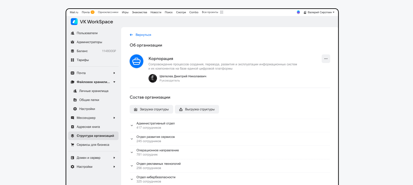 Создавайте подробную структуру компании и загружайте данные из корпоративных систем