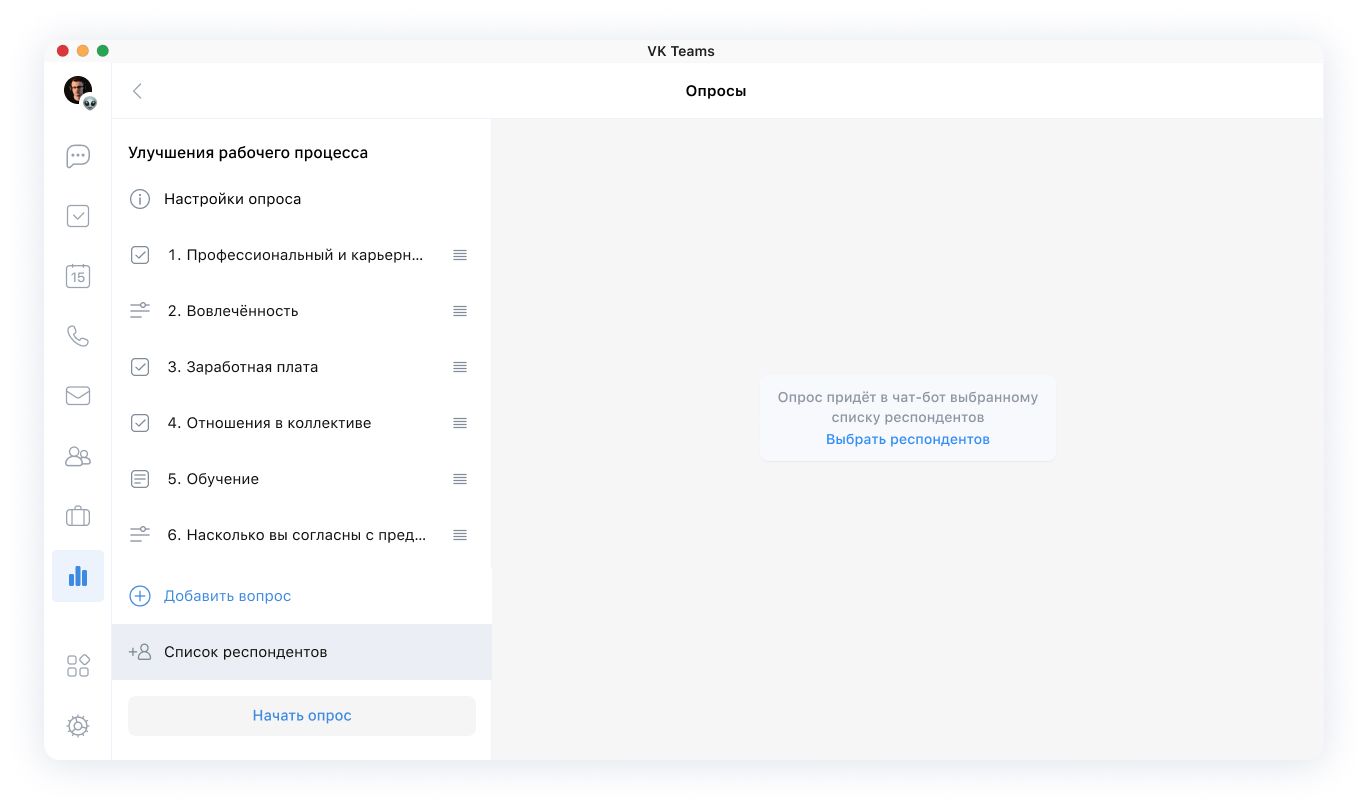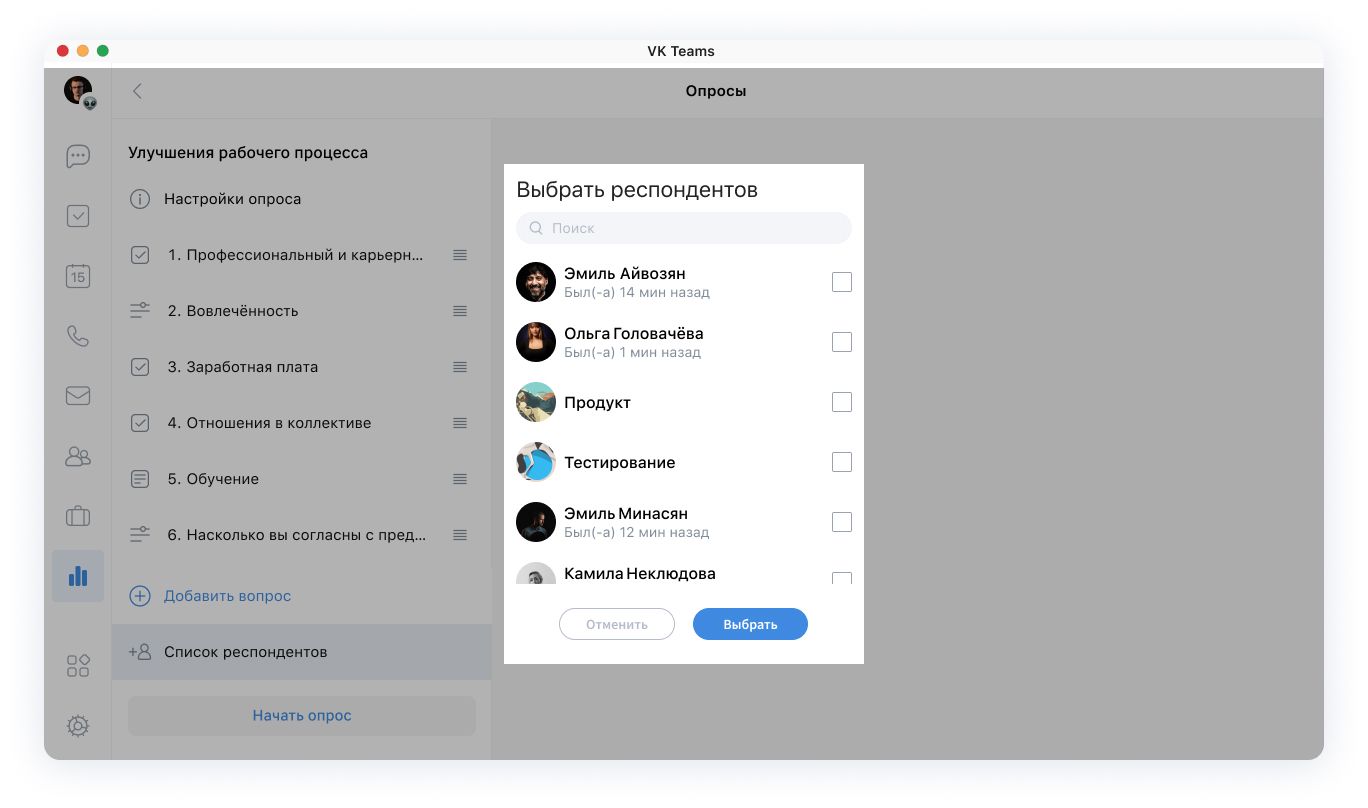 Шаг 4. Если сделали опрос закрытым, нажмите на «Список респондентов» на левой панели, кликните «Выбрать респондентов» и определите, кому из контактов VK Teams придёт уведомление. Если опрос общедоступный, пропустите этот шаг.