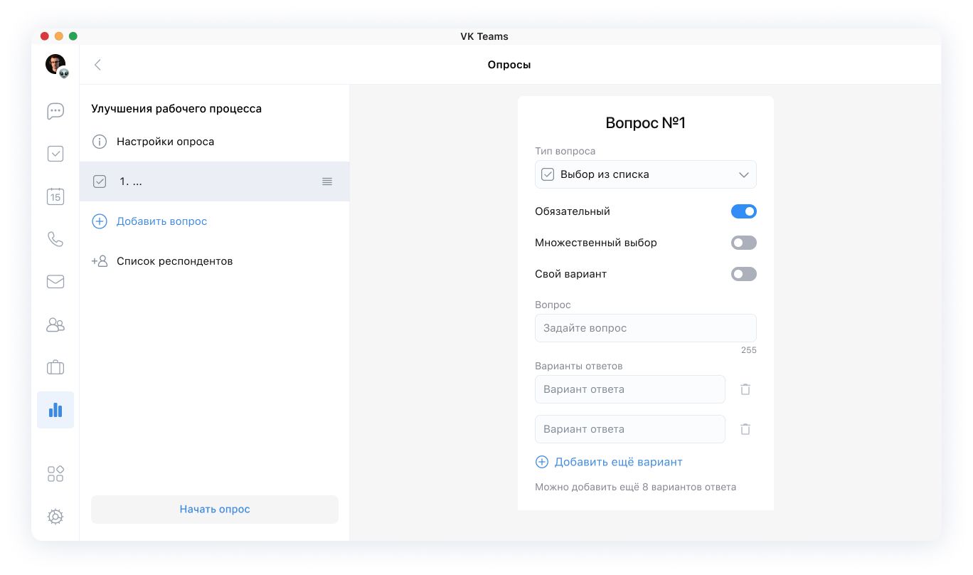 Создать опрос может каждый сотрудник, зарегистрированный в VK Teams. Для этого нужно пройти пять шагов: