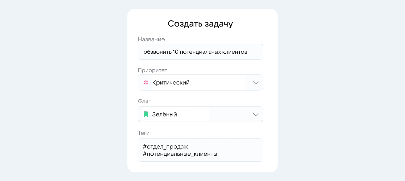 Добавьте теги. Это параметр, который позволяет классифицировать задачи. Теги не стандартизированы — можно добавлять свои. Например, руководитель ставит теги «потенциальные_клиенты» и «план_продаж».