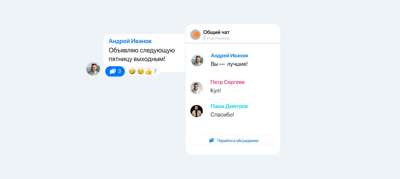 Представьте, что вы попросили коллегу сделать отчет, а он пришел с уточнениями. Сначала написал в чате, потом отправил письмо по почте, а затем позвонил по телефону. Переключаться между разными сервисами неудобно. В VK Teams можно обсуждать задачи здесь же, в приложении — в специальном пространстве обсуждения.