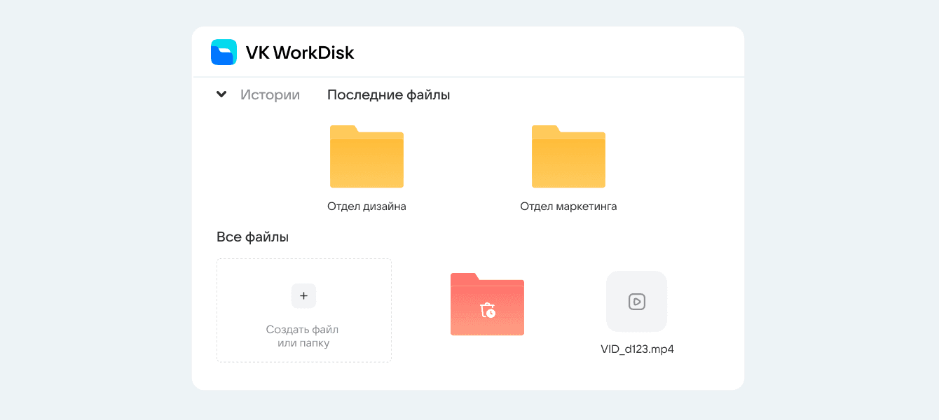 В облаке VK WorkDisk можно создать систему папок — например, «Бухгалтерия», «Маркетинг», «Продажи».Так бухгалтер быстро найдет свои документы, а инженер — свои. Правила хранения каждая компания выбирает сама: можно делать папки для каждого проекта или разных отделов. Главное, чтобы команда могла ориентироваться в облаке и знала, как использовать общий диск.