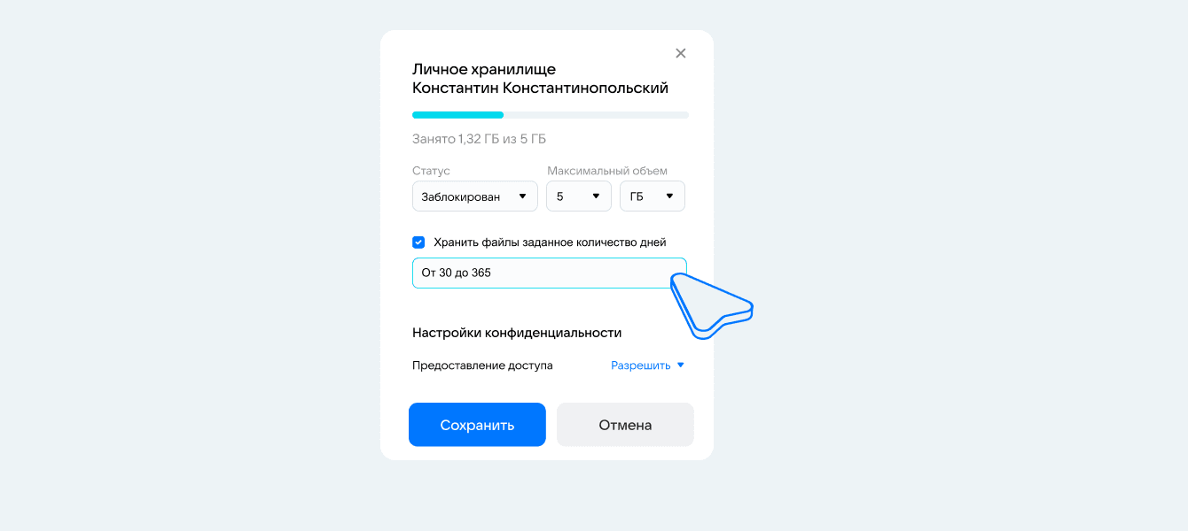 Чтобы команда рационально использовала пространство, выбирайте хранилища, в которых можно разделить общий объем между сотрудниками. Такая опция есть у VK WorkDisk. Например, команде дизайнеров можно выделить 100 ГБ, а менеджеру по закупкам хватит 10 ГБ. Так все будут следить, чтобы в облаке не было лишнего, ведь место ограничено.