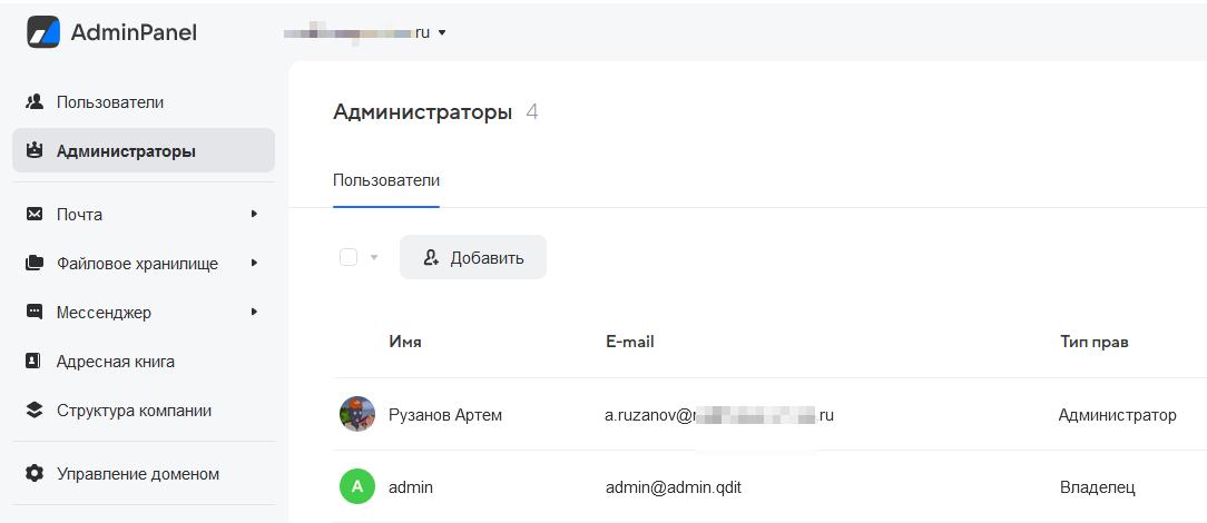 Раздел Администраторы предназначен для управления списком администраторов. Вы можете добавлять и удалять администраторов, а также менять их права доступа.