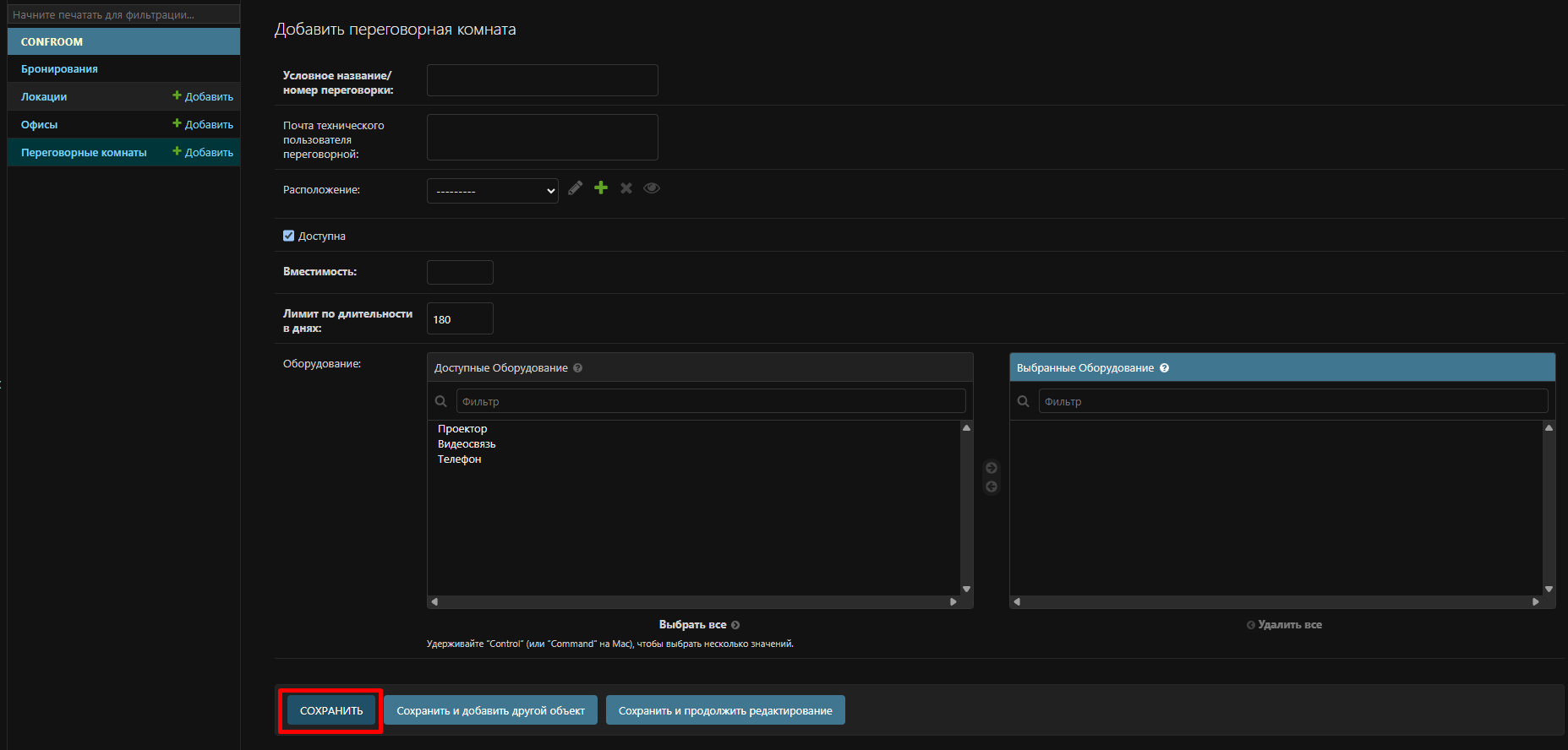 Заполните поля: название (обязательное поле), офис, ID группы переговорок из exchange (поле используется для миграции переговорных). Нажмите на Сохранить.
