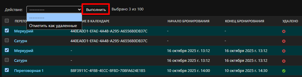 Для выполнения массовой отмены бронирования выберите все необходимые переговорные в столбце Переговорная комната, нажмите Действие и выберите опцию Отметить как удаленные. После выбора опции нажмите Выполнить.