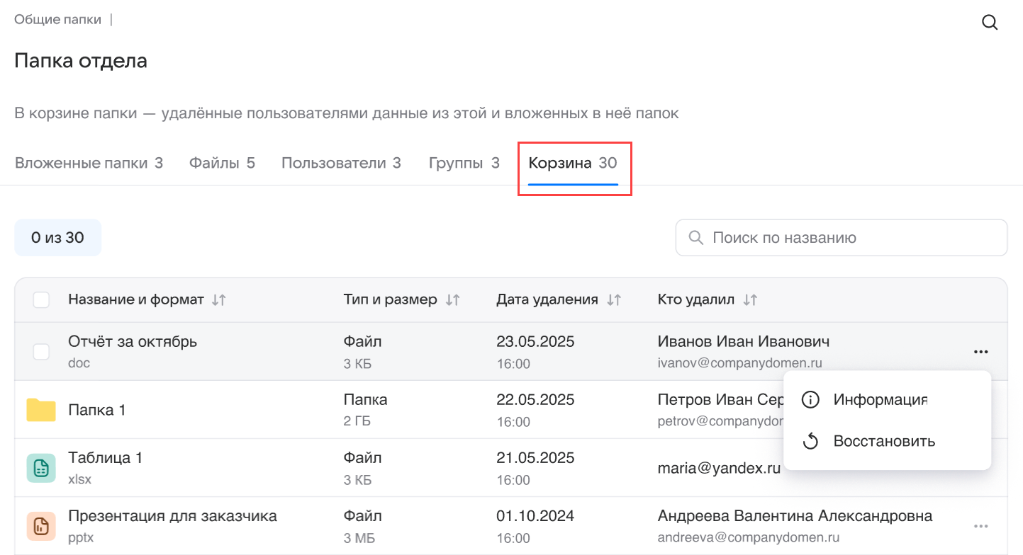 В корзине домена, по возможности, сохраняется иерархия общих папок (система вложенности), какой она была до удаления. Пример: