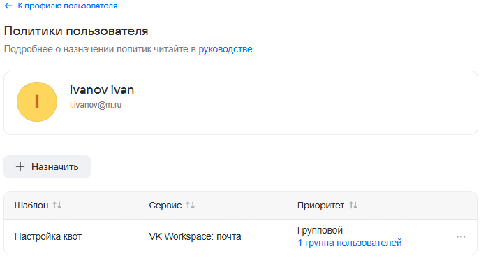 - Не рекомендуется назначать политику отдельным пользователям; основной сценарий работы с политиками — это назначение политик группам, кроме специфических случаев. Подробнее см. в разделе «Работа с личными политиками».