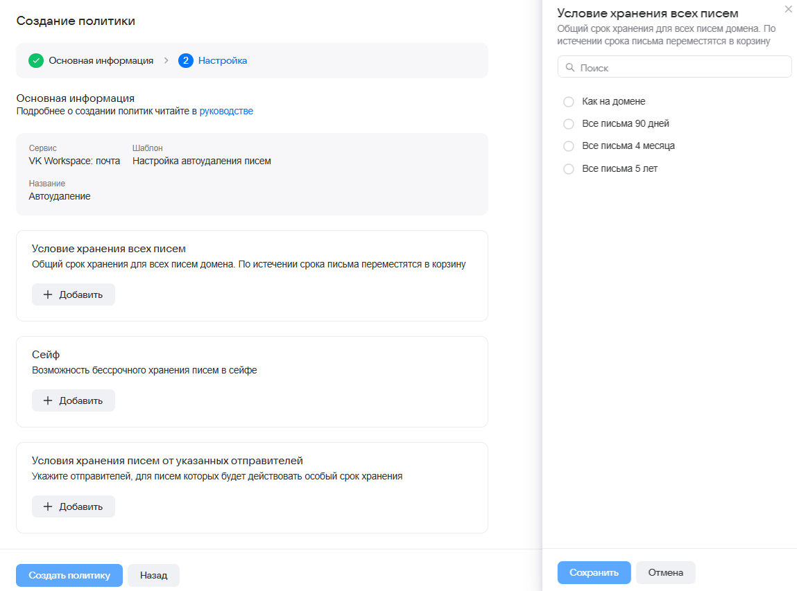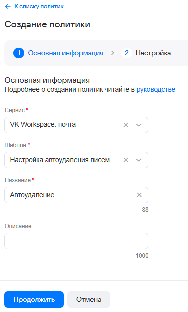 Заполните форму создания политики: выберите сервис VK WorkSpace: Почта и шаблон Настройка автоудаления писем, заполните поле Название. Нажмите Продолжить.