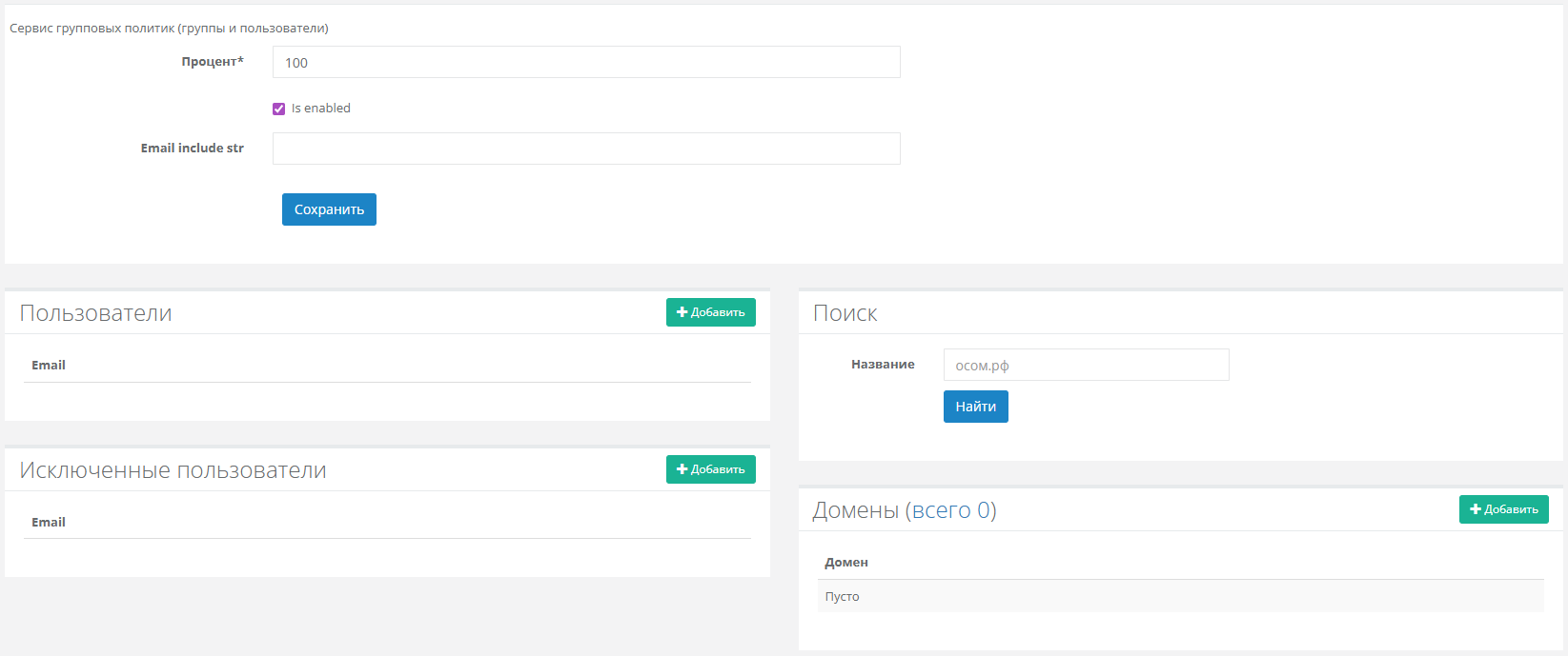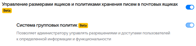 При включении фичи group-policy будет доступен раздел Политики и групповая политика Управление размерами ящиков и политиками хранения писем в почтовых ящиках. Для включения других групповых политик перейдите к шагу 2.